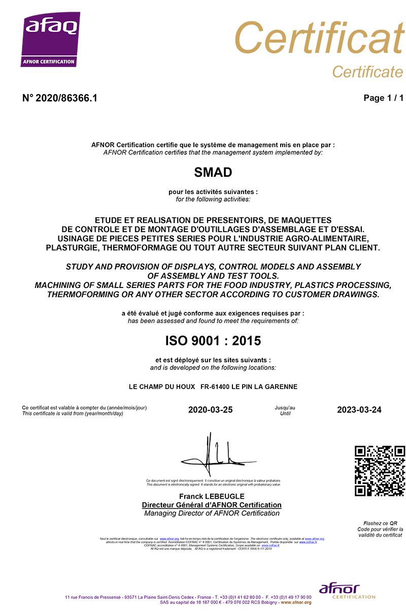 Une organisation et des procédures en compliance avec la certification ISO 9001. LA SMAD EST CERTFIEE ISO 9001 VERSION 2015